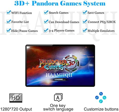 Resolution 1280x720P HD graphics. Fully compatible with all HD TV/Monitor screens and Projectors. Pause Games Stop or start games whenever. Save/Read 2D game You can save the 2D game you are playing at any time, and you can continue playing next time (Some 3D games are not supported). Hide Games Avoid kids playing inappropriately games. Search Games Quickly find the game you want to play, English/Japanese/Spanish search by first letter. Korean search by radical. Chinese search by pinyin. Image Enhancement Users can select [HD] / [Scan Line] / [Normal] and other image quality according to their individual needs. Favorite List Go to Setting Page > Enter Game Setting > Edit Favorite List > Select Game to Favorite or Unfavorite. WIFI Function Upgraded 1. Press Setting Button (near to USB port); 2. Choose “WiFi” option, connect your home wifi name and password; 3. Then back to choose “Enter game market“ to download extra 2d /3d games from the machine itself. Multiplayers Game Online Buy 2 gamepad and USB hub (connect to the bottom USB port) to enjoy 3/4 people to play at the same time; Or buy 2 same game box to enjoy 3-4 players games. Customizable Buttons Adjust the definition / order of the buttons for whatever they want. Language Mode English/Japanese/Korean/Spanish/Simplified Chinese/Traditional Chinese are supported. Multi Emulators MAME/FC/SFC/PCE/GBA/GBC/MD/PSP/PS/N64/DC/WSC/FB A 13 emulators supported. Compatibility TV/PC/Screen/Monitor/Projector/PS3 Need Game List Please click on “HAAMIIQII Direct”; then “Ask a question” for full game list of 3D+ Pandora Games. Game System 3D+ Pandora Games with wifi function Game Quantites 250*3D Games + 7750*2D Games = 8000 Games