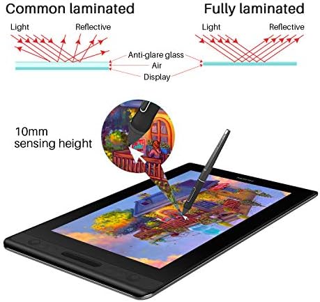 Huion Pro 13 drawing tablet with screen adopts the latest full-laminated technology, creates a paper feel-like surface and almost no parallax. Equip with anti-glare glass panel to keep your screen clear even in bright light. Each line came out exactly like you wanted, smooth tapers, no shaky lines, no blotches and no parallax.
